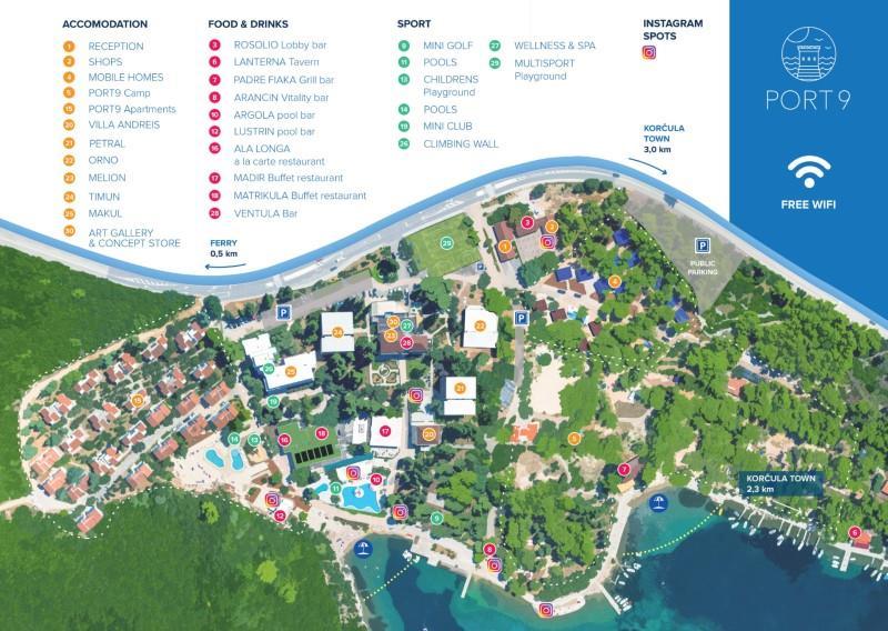 Ostrov Korčula, který leží před poloostrovem Pelješac, patří mezi největší chorvatské ostrovy. Nabízí izolovanost od hlučného velkoměsta a dostatečné množství zábavných aktivit a turistických služeb. Na ostrově je sedm měst, mezi největší a nejnavštěvovanější patří Korčula, Velka Luka, Blato a Lumbarda. Korčula je ostrov s dlouhou a bohatou historií. Každý si zde něco najde, od kvalitního jídla, vynikajících vín, přes luxusní ubytování až po bohatou nabídku kvalitních služeb na celém ostrově. Ubytování v residenci Port 9****Apartmány se nachází v klidné zátoce s charakteristickým názvem Shell Bay, která je vzdálená přibližně 2,5 km od starého města Korčula. Apartmány jsou obklopeny olivovníky a další středomořskou vegetací. Do centra města se dostanete pohodlnou procházkou po mořském pobřeží nebo po moři na lodi s taxi. Tyto apartmány jsou ideální pro rodinnou dovolenou. K dispozici je v resortu hned několik restaurací, barů, kavárna, multifunkční hřiště (volejbal, basketbal, tenis), půjčovna a úschovna kol nebo skútrů za poplatek, minigolf, stolní tenis, venkovní bazén se sladkou vodou - druhý s mořskou vodou (slunečníky a lehátka k dispozici zdarma) a dětský bazén. Dále residence poskytuje sportovní a večerní programy s živou hudbou, tanečními vystoupeními a další zábavou pro dospělé. Pro nejmenší jsou zde k dispozici dětské mini kluby pro různé věkové kategorie s animačními programy a zábavnými workshopy. Hostům je k dispozici také wellness a fitness centrum. Domácí mazlíčci jsou zde povoleni na vyžádání u CK a za poplatek 20 €/den/zvíře. Parkoviště k dispozici za poplatek cca 5 €/den (omezená kapacita, nelze rezervovat). Resort přijímá platební karty typu Visa, Diners Club, Mastercard a Maestro. Apartmán typ AApartmán o výměře cca 38,5 m2 až pro 4 osoby je vybaven sociálním zařízením, ložnicí, obývacím pokojem s pohovkou pro 2 osoby a vybaveným kuchyňským koutem. K dispozici je také klimatizace, fén, trezor, SAT/TV, telefon a WiFi připojení. Apartmán má k dispozici terasu nebo balkon. Apartmán typ CApartmán o výměře cca 40 m2 až pro 5 osob je vybaven sociálním zařízením, ložnicí se třemi lůžky, obývacím pokojem s rozkládací pohovkou pro 2 osoby a vybaveným kuchyňským koutem. K dispozici je také klimatizace, fén, trezor, SAT/TV, telefon a WiFi připojení. Apartmán má k dispozici terasu nebo balkon. Bez stravování
