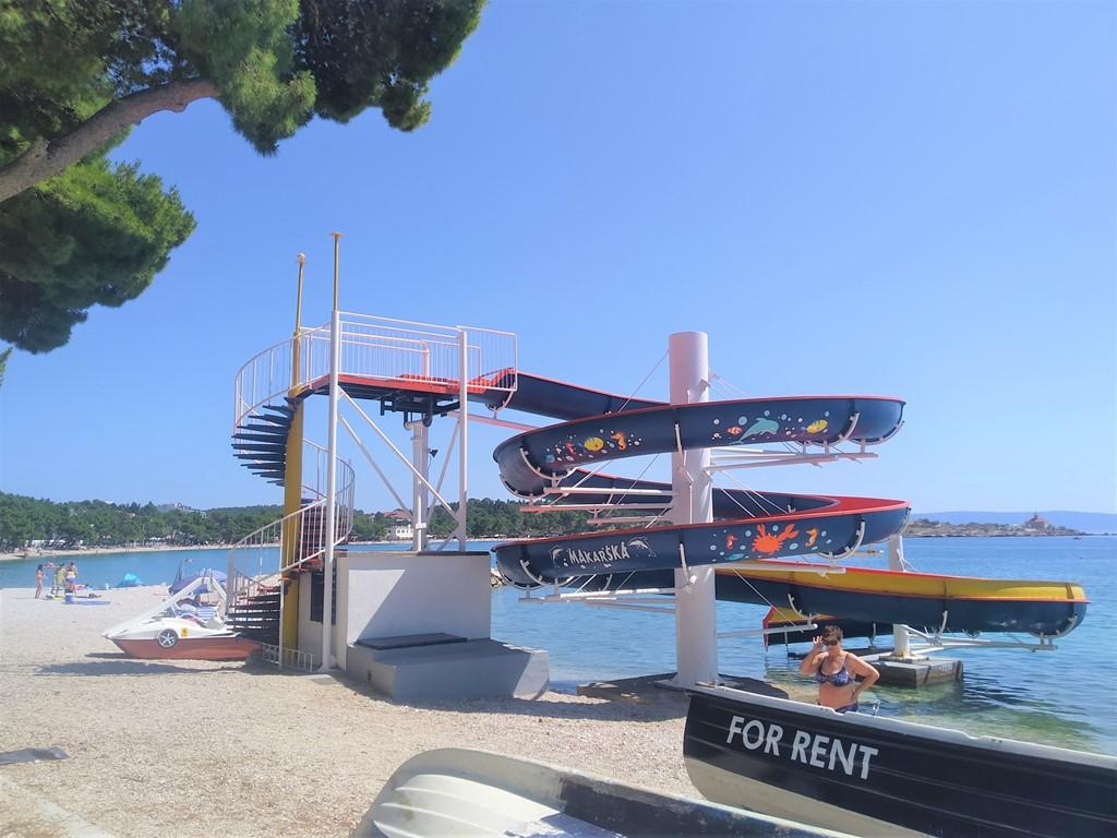 Pláž: oblázková s pozvolným vstupem do moře i kamenná plata s upravenými plochami. Na centrální pláži je tobogán.