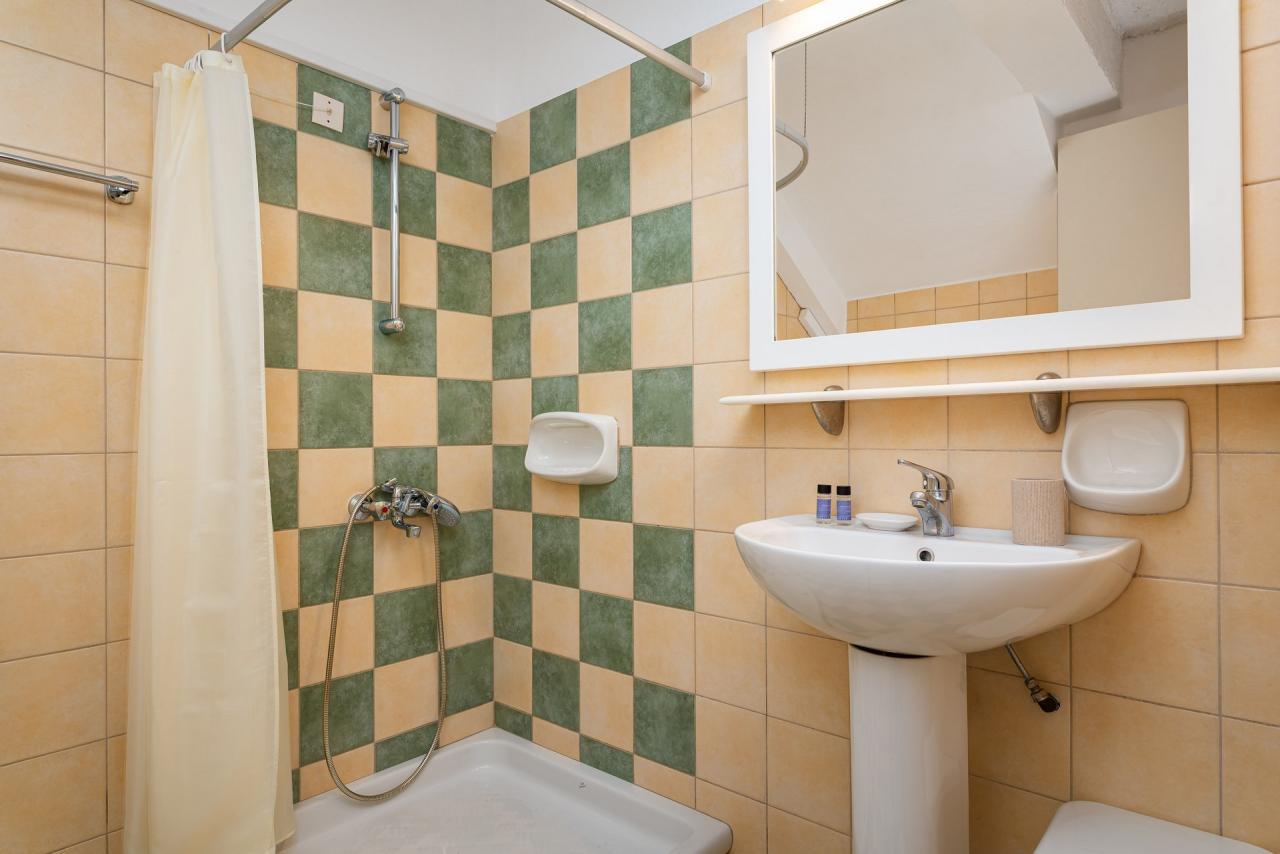 Přímo u světlé oblázkové pláže s pozvolným vstupem do moře, která je oddělena pouze pobřežní komunikací. Lehátka a slunečníky na pláži za poplatek.