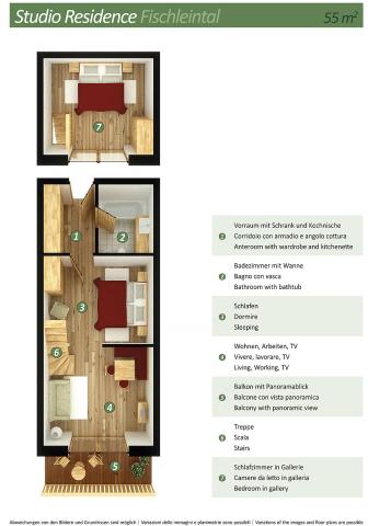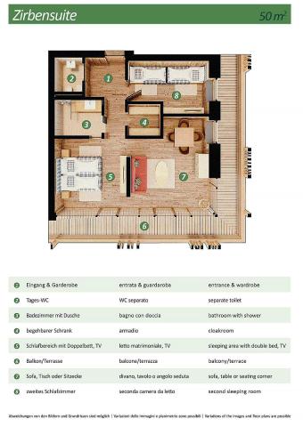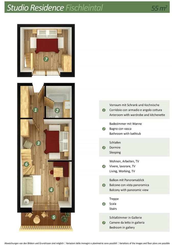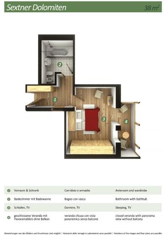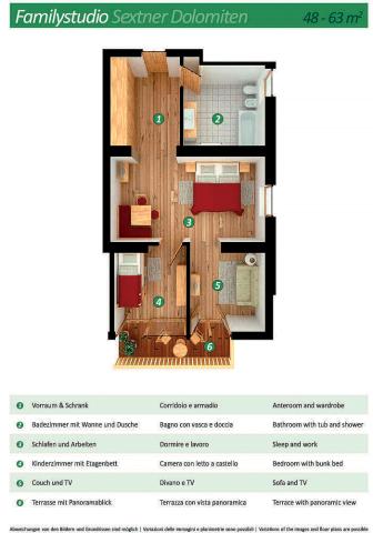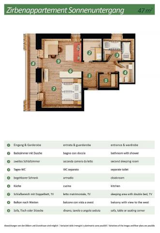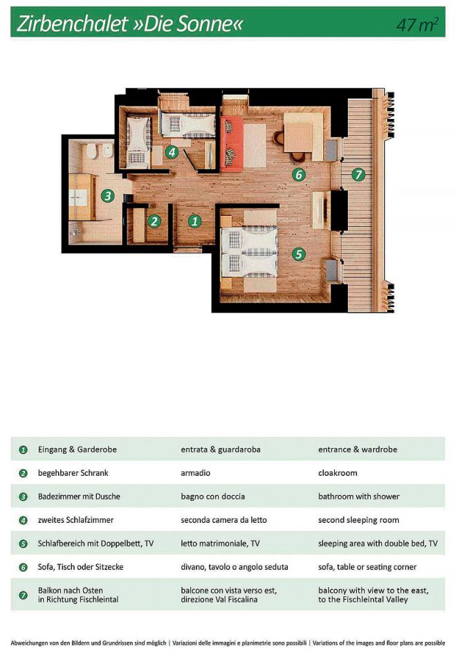 gaučem pro 1 osobu, sociální zařízení se sprchou, balkon #Dolomiti di Sesto 2/3: 28 až 35 m² - pokoj s manželskou postelí a případně rozkládacím gaučem pro 1 osobu, sociální zařízení se sprchou či vanou, balkon #Zirbenchalet II Sole 2/3/4: 47 m² - pokoj s manželskou postelí, pokoj se 2 samostatnými lůžky, sociální zařízení se sprchou, balkon #Zirbenappartment Tramonto 2/3/4: 47 m² - pokoj se 2 samostatnými lůžky, obývací pokoj s manželskou postelí a uzavíratelným kuchyňským koutem, sociální zařízení se sprchou, 1x WC navíc, balkon #Studio Larice 2/3/4: 40 m² - pokoj s manželskou postelí a případně rozkládacím gaučem pro 2 osoby, sociální zařízení se sprchou, balkon či terasa #Studio Larice Mezonet 3/4/5: 55 m² - pokoj s manželskou postelí, pokoj s manželskou postelí a rozkládacím gaučem pro 1 osobu v rámci zvýšeného patra, sociální zařízení se sprchou, balkon či terasa #Zirben Suite 2/3/4: 50 m² - pokoj s manželskou postelí, pokoj s 2 samostatnými lůžky, sociální zařízení se sprchou, balkon či terasa #Family Studio Monte Elmo 3/4/5: 48 m² - pokoj s manželskou postelí a rozkládacím gaučem pro 1 osobu, pokoj s 2 samostatnými lůžky či palandou, sociální zařízení se sprchou, balkon #Family Studio Dolomiti Sesto 3/4/5: 48 m² - pokoj s manželskou postelí a rozkládacím gaučem pro 1 osobu, pokoj s 2 samostatnými lůžky či palandou, sociální zařízení se sprchou, balkon |