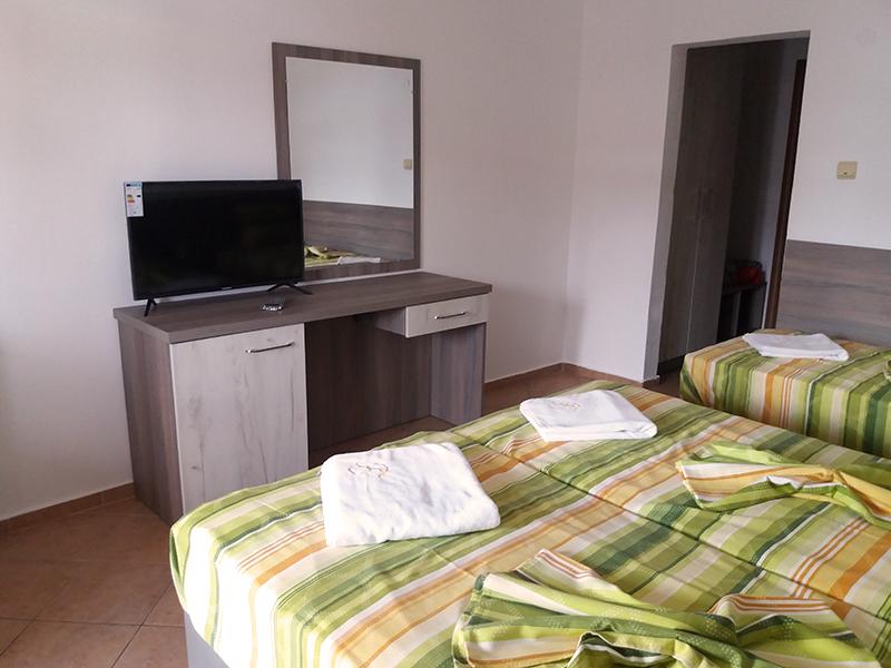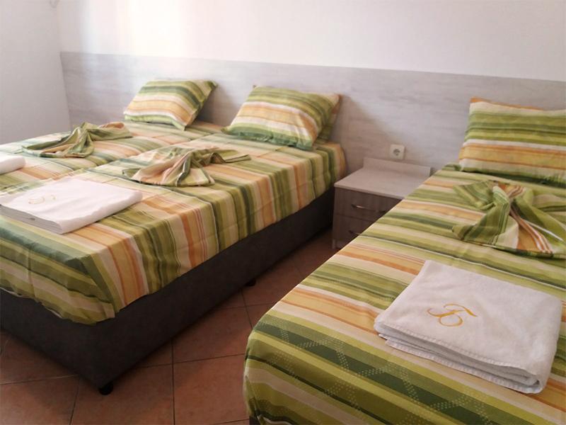 standardně vybaven. Skládá se z jedné místnosti a tří pevných lůžek bez možnosti přistýlky. Součástí vybavení je TV/SAT, mini lednice, wi-fi, klimatizace (za poplatek) a sociální zařízení balkánského typu (sprcha nemá okrajovou hranu), balkon s posezením. Pokoje jsou orientovány s výhledem do okolí nebo na moře.