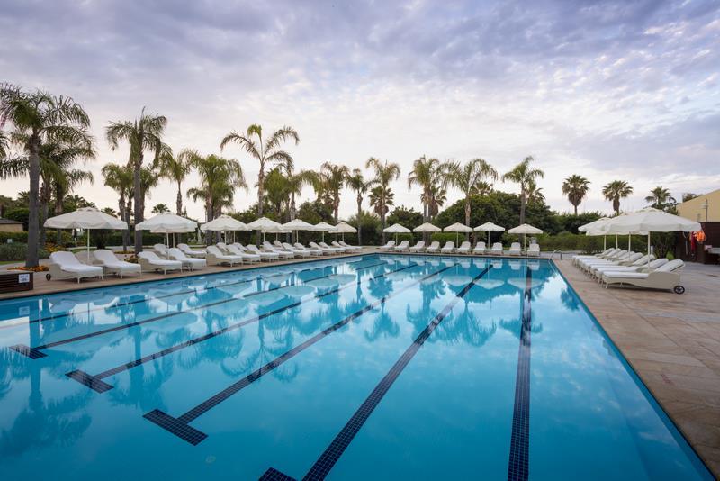 rozsáhlý areál je tvořen 7 hlavními budovami válcovitého tvaru vsazenými do piniového háje a udržovaných zahrad, které přes venkovní část areálu přecházejí na dlouhou a širokou písečnou pláž (v přilehlé části náleží hotelu) se 2 dřevenými moly zapuštěnými do moře. Areál doslova působí jako oáza, je zde vidět smysl pro detail a luxusní provedení snoubící se se zajímavou architekturou. V hlavní budově Vás uvítá majestátně působící vstupní hala s recepcí a výtahy a prostorným lobby s vnitřním barem. Vnitřní prostory dále nabízí společenské prostory, salónky, business centrum, herny, dětský koutek, několik konferenčních sálů různé kapacity, obchůdky se suvenýry aj. Zcela jistě potěší hotelové Spa centrum se 2 velkými vnitřními vyhřívanými bazény, vířivkou, saunou, tureckými lázněmi, možností masáží všech druhů anebo revitalizačních procedur v beauty centru. K udržování se v kondici poslouží profesionálně vybavené fitness centrum. Stravovací služby obstarávají hlavní bufetová restaurace a dalších 5 a´la carte tematických restaurací (vnitřní i venkovní, turecká, asijská, mezinárodní aj.). K posezení u kávy či chutného nápoje poslouží celkem 8 barů (vnitřní i venkovní, pool bary, beach bar, piano bar, snack bar, zahradní aj.). Venkovní areál, skýtající i dostatek stínu díky vzrostlé zeleni, nabídne hlavní bazén (3800 m2) nepravidelných tvarů s řadou přemostění a ostrůvků, dále semi-olympijský bazén (310 m2), aquapark s 5ti skluzavkami a tobogánem (510 m2), relaxační bazén (115 m2) a velký dětský bazén (115 m2). Celý areál je protkaný slunečními terasami s lehátky a slunečníky (v ceně). K aktivnímu odpočinku je pro hosty připravený nespočet možností-tenisové kurty, minifotbal, basketbal, lukostřelba, biliár, šipky a pochopitelně velká nabídka zábavných i soutěžních animačních programů pořádaných hotelem-aerobic, jóga, pilates, dětský klub, diskotéky, vystoupení, soutěže. Nuda zde skutečně žádný prostor nemá. Na pláži lze využít nabídky středisek vodních sportů nebo potápěčských bází. U recepce lze sjednat transfery do okolí, eventuálně pronájem jízdních kol či vozidel. Soukromé parkování je pro hosty zdarma. Nejbližší golfový resort je vzdálen cca 3 km. |