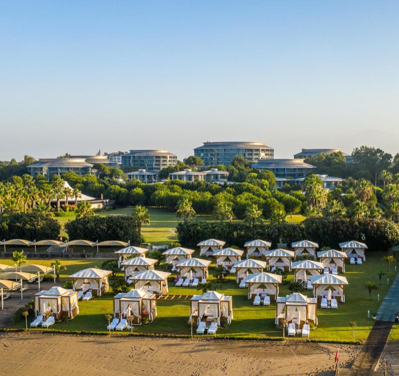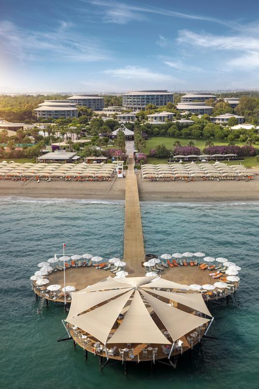 luxusní hotelový komplex s unikátní architekturou, rozléhající se na úctyhodné ploše 120 000 m2 , se pyšní skvělou polohou přímo dlouhé písečné pláže s pozvolným vstupem do moře v oblasti střediska Kadriye (centrum 5 km od hotelu). Hlavní středisko oblasti-Belek-je pak vzdáleno 10 km. V nedalekém okolí se nabízí nákupní možnosti, rovněž tak lze jednoduše navštívit některá vzdálenější turisticky zajímavá místa: římský akvadukt či amfiteátr Aspendos (15 km), město a turistický cíl oblasti plný turistických lákadel - Antalya (centrum 35 km) anebo další oblíbené pláže této oblasti-Kadriye (3.2 km), Serik belek (4.4 km) či Bogazkent pláž (7 km). Cestování Vám usnadní místní autobusová doprava anebo hotelové taxi. Letiště Antalya je vzdáleno 27 km (doba transferu cca 30 min). |