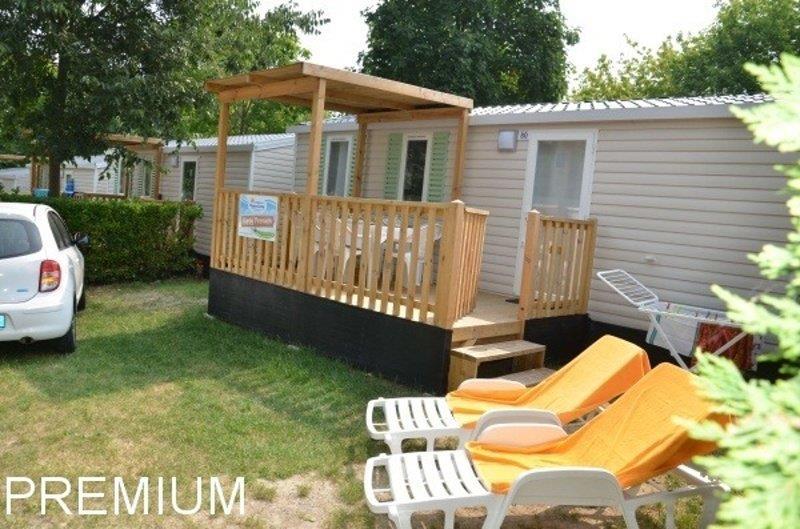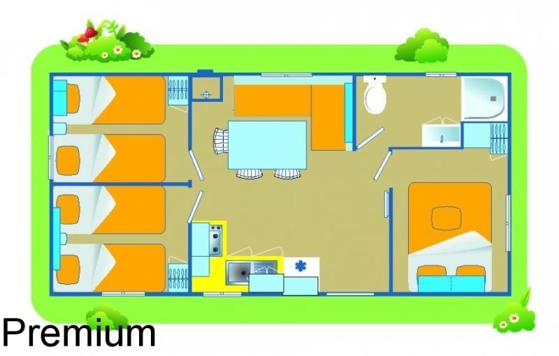 M4/6 PREMIUM (max. 4-6 osob, 29 m2) ložnice s dvojlůžkem, dvě ložnice se dvěma lůžky, denní místnost se sedacím koutem a kuchyňským koutem, SPR+WC, klimatizace (za příplatek). Částečně krytá dřevěná terasa se zahradním nábytkem a grilem. Novější typ mobilhomu. 5., 6. osoba vždy za příplatek (nahlášení je nutné již při rezervaci). |