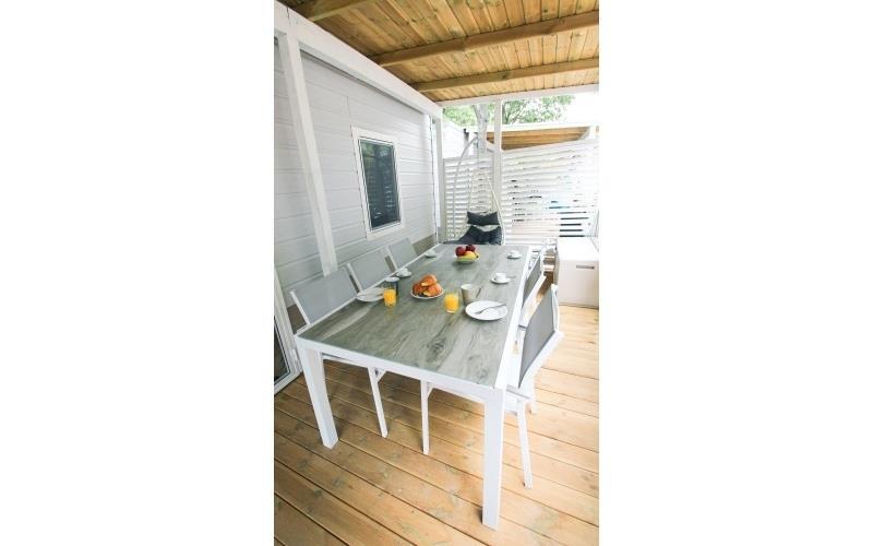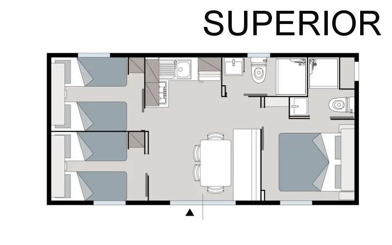 M4/6 SUPERIOR (max. 4-6 osob) ložnice s dvojlůžkem, dvě ložnice se dvěma lůžky, denní místnost se sedacím koutem a kuchyňským koutem, 2x SPR+WC, klimatizace (za příplatek), krytá dřevěná terasa se zahradním nábytkem a grilem. Na terase 2x lehátko a příp. závěsné křeslo. Nový typ mobilhomu. 5., 6. osoba vždy za příplatek (nahlášení je nutné již při rezervaci). |