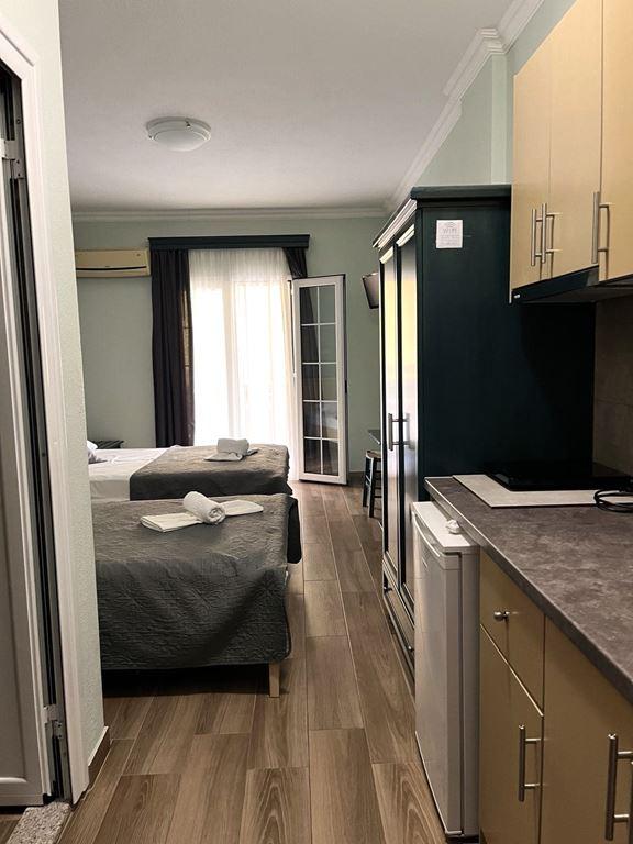 místnost se dvěma lůžky nebo manželskou postelí (š.140 cm nebo 160 cm) s dalšími 2 lůžky v rámci jedné místnosti ( pevné lůžko šířky 140 cm nebo160cm ). Součástí je kuchyňský kout, který je uzpůsoben pro jednoduchou přípravu jídla. Je vybaven základním nádobím odpovídajícímu počtu osob. Dále pak lednička, vařič, varná konvice, TV, vlastní sociální zařízení, sprchový kout balkánského typu, balkon (případně v přízemí terasa) se zahradním nábytkem.