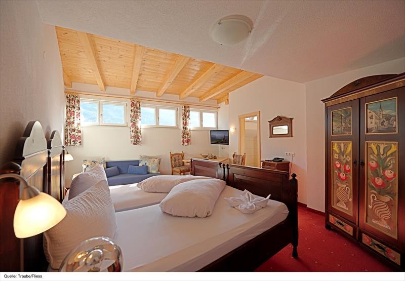 pokoje zařízené v tyrolském stylu mají koupelnu s WC, TV-Sat, fén a některé i balkon. V 2-3 lůžkovém pokoji bez balkonu může být na 3. lůžku jen osoba do 17,9 let.
