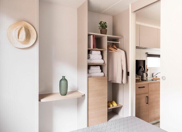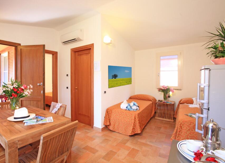 ložnice s manželskou postelí, obývací pokoj se dvěma lůžky a kuchyňským koutem