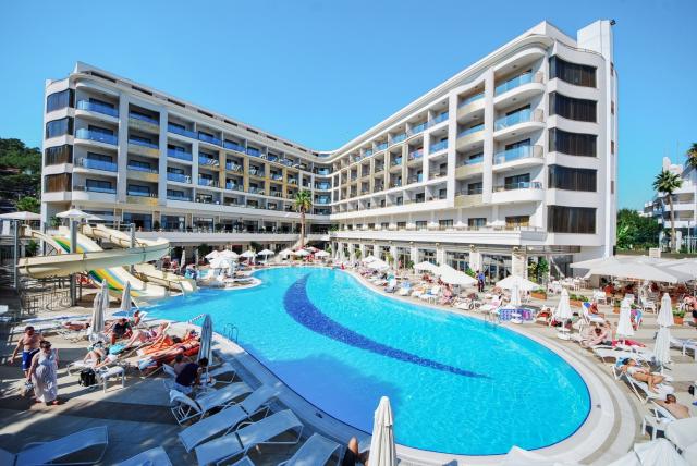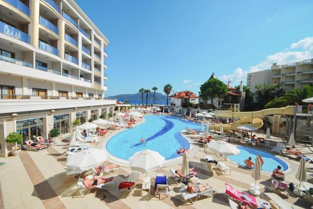 Golden Rock Beach Hotel se nachází v blízkosti centra města Marmaris. Do města je možné dojít po místní promenádě, která vede hned u hotelu. Jedná se o menší, kompaktní hotel se službami All Inclusive a bazénem se skluzavkami. V okolí hotelu naleznete mnoho obchůdků, restaurací a barů. Hotel můžeme doporučit všem věkovým kategoriím a je ideální volbou pro rodinnou dovolenou. |