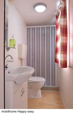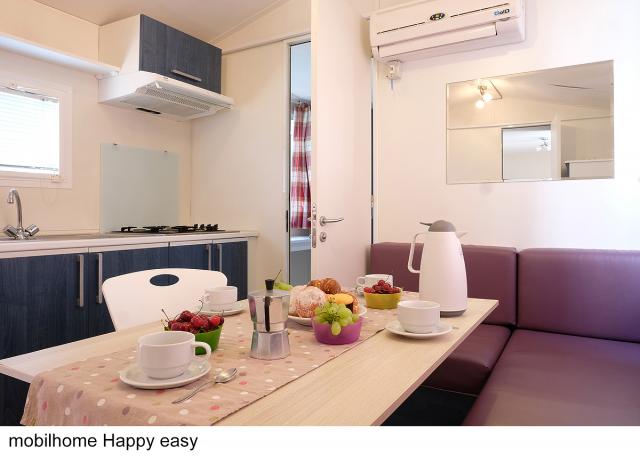 mobilhome Happy easy 5+1: 24 m² - ložnice s manželskou postelí, ložnice se 2 samostatnými lůžky a 1 zavěšeným lůžkem (pro dítě do nedovršených 10 let), obytná část s kuchyňským koutem a lavicí přestavitelnou na lůžko, sociální zařízení se sprchou, částečně krytá dřevěná terasa