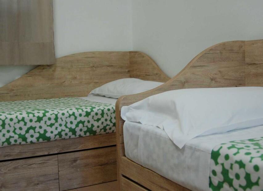 ložnice s manželskou postelí, ložnice se dvěma lůžky a nad nimi vyvýšeným lůžkem (povoleno pouze dítě do 10 let), obývací pokoj s kuchyňským koutem.
