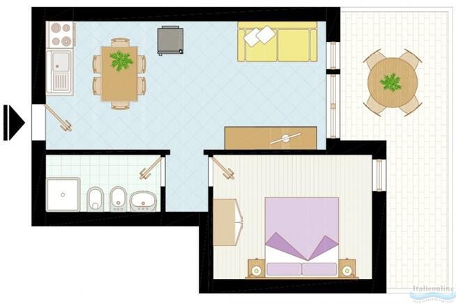 obývací pokoj s gaučem pro dvě osoby a kuchyňským koutem, ložnice s manželským lůžkem, koupelna, balkon, klimatizace. |