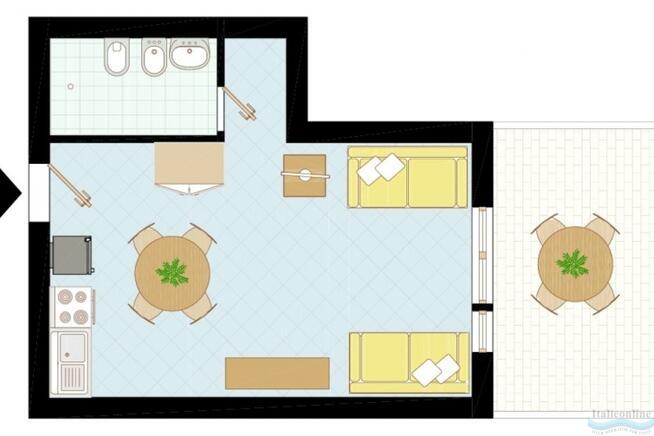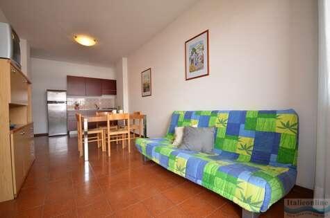 obývací pokoj se 2 gauči (každý pro dvě osoby) a kuchyňským koutem, koupelna, balkon. Klimatizace. |