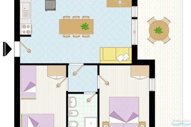 obývací pokoj s gaučem pro dvě osoby a kuchyňským koutem, ložnice s manželským lůžkem a jednolůžkem, koupelna, balkon, klimatizace. |