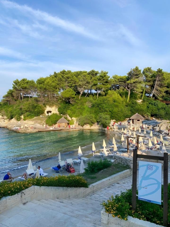3 pláže, "Caletta Centrale" - hlavní písečná pláž (mohou být i menší oblázky), na bočních terasách a na trávnících jsou lehátka zdarma, mimo tyto zóny za poplatek, "La Cricca" - pláž v zátoce s jeskyní zvanou "delle Pupe", lehátka a slunečníky jsou na terasách, dřevěné plošině a trávníku, "Le Vele" - pláž s terasou a trávníkem, lehátka a slunečníky jsou na terasách a trávníku