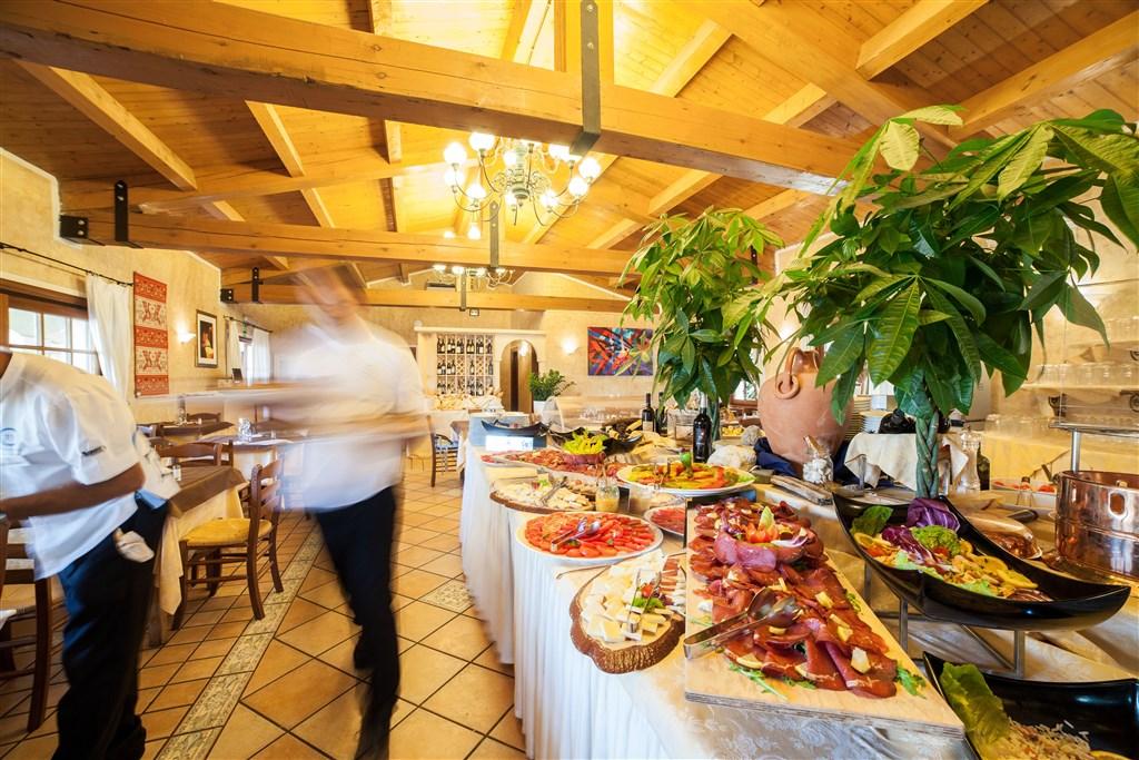 Polopenze s nápoji. Základní stravování v hotelu je polopenze - sladký a slaný bufet k snídaní a výběr ze středomořského bufetu k večeři. Za příplatek možná plná penze formou bufetu. U hlavních jídel je v ceně voda a nealkoholické nápoje, u večeře stolní víno. Další nápoje jsou za poplatek. Hotelová restaurace RisTHó - prostory tvoří několik vnitřních sálů (některé klimatizované) i venkovní prostory. Na náměstíčku jsou dále stolky s židlemi pod slunečníky, s večerním LED osvětlením. Hostům je v hotelové restauraci při příjezdu přidělen stůl na celou dobu pobytu. Kuchyně nabízí bohatý bufet s nabídkou místních specialit i mezinárodní a italské recepty. V bufetu se podávají předkrmy, 1. a 2. chody, maso, ryby, sezónní zelenina a ovoce, dezerty a typické pokrmy sardinské kuchyně. Z restaurace je nádherný výhled na ostrov Tavolara, obzvlášť večer při západu slunce. Na vyžádání bezlepkové pokrmy - nutno konzultovat předem. Časy jednotlivých chodů: snídaně 7:30-10 h, oběd 12:30-14 h, večeře 19:30-21:30 h. AperiTHcafé - centrální bar u bazénu, naproti hlavnímu náměstíčku, s venkovním posezením nabízí osvěžení během dne, za poplatek. RisTHó Land - prostor pro děti v restauraci, kde se podává denně speciální obědové dětské menu (ne ve střídací dny, tj. v den odjezdu a příjezdu). Děti zde jedí s animátory. V barech lze platit pouze předplacenou kartou, kterou lze nabít na recepci.