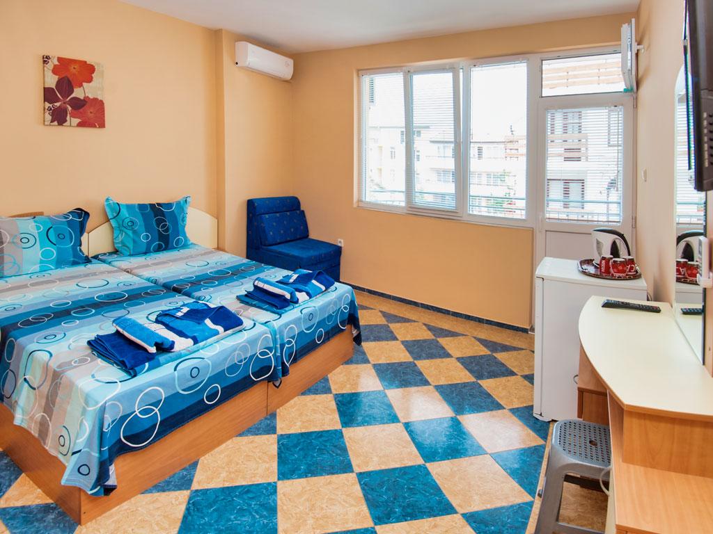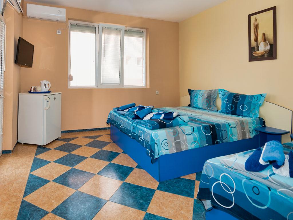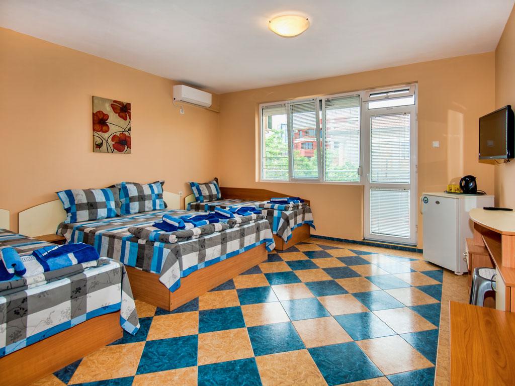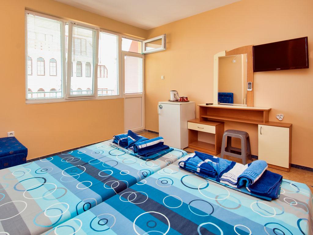 Pokoje s balkonem a sociálním zařízením (sprcha, WC) jsou klimatizovány (klimatizace zdarma) a vybaveny TV/SAT, Wi-Fi (zdarma), chladničkou a varnou konvicí. Možnost tří přistýlek. Maximální obsazenost čtyři dospělí a jedno dítě. |