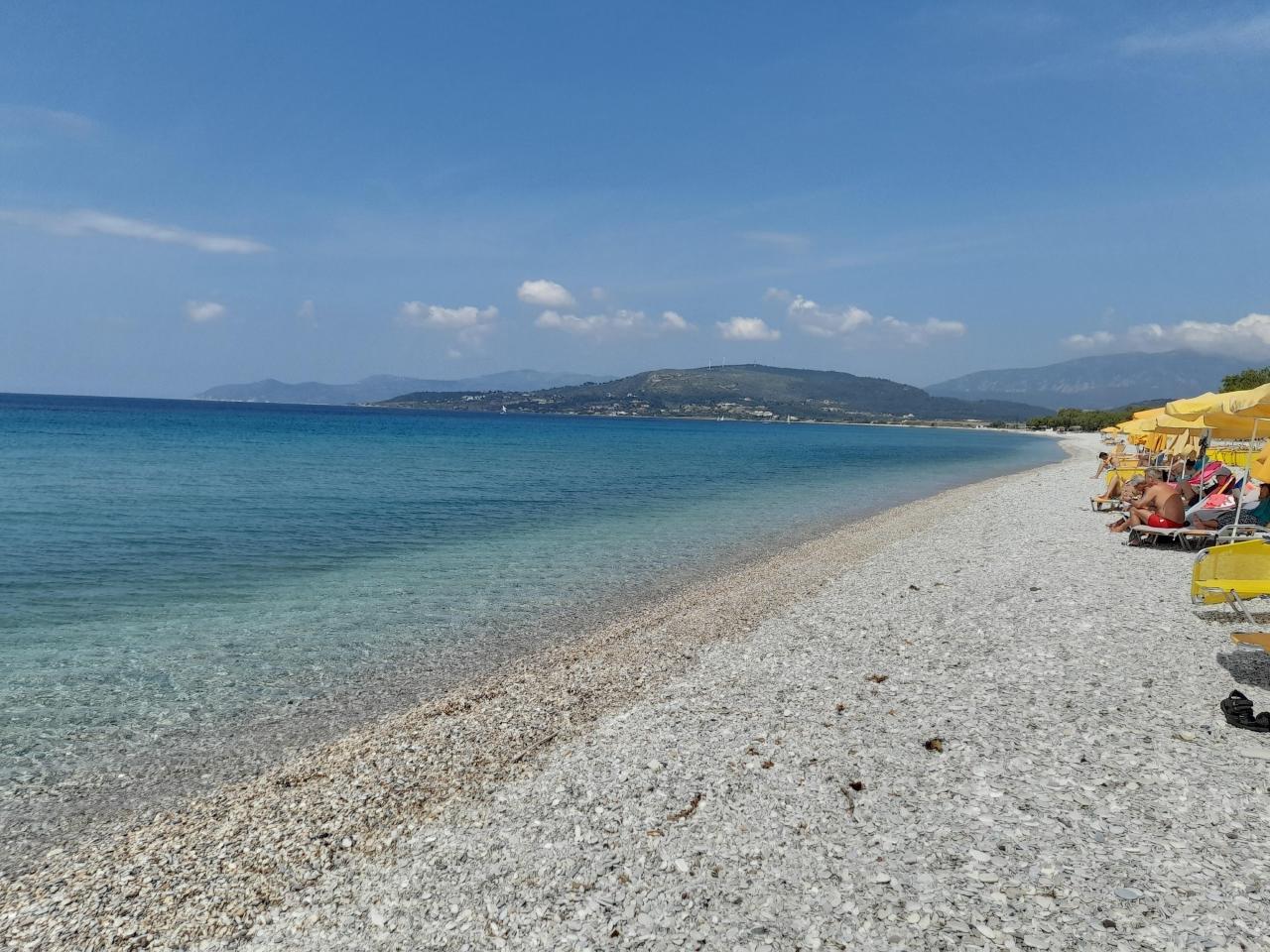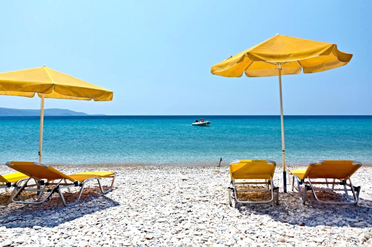 Dlouhá oblázková pláž s pozvolným vstupem do moře přímo u hotelu, lehátka a slunečníky zdarma. |