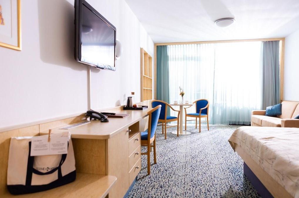 Hosté se zde mohou ubytovat v komfortně vybavených jedno nebo dvoulůžkových pokojích typu Standard, Comfort a Suite. Rodiny s dětmi mohou využít pokoj typu Comfort o rozloze 28 m2 s manželskou postelí a rozkládacím gaučem, vhodným jako přistýlka pro dvě menší děti, nebo apartmán o rozloze 34 m2 s oddělenou obývací částí a ložnicí. Ke standardní výbavě patří klimatizace, koupelna se sprchovým koutem nebo vanou, vysoušeč vlasů, toaletní potřeby, 37palcová LCD TV, trezor, minibar, psací stůl, balkon a WIFI. |