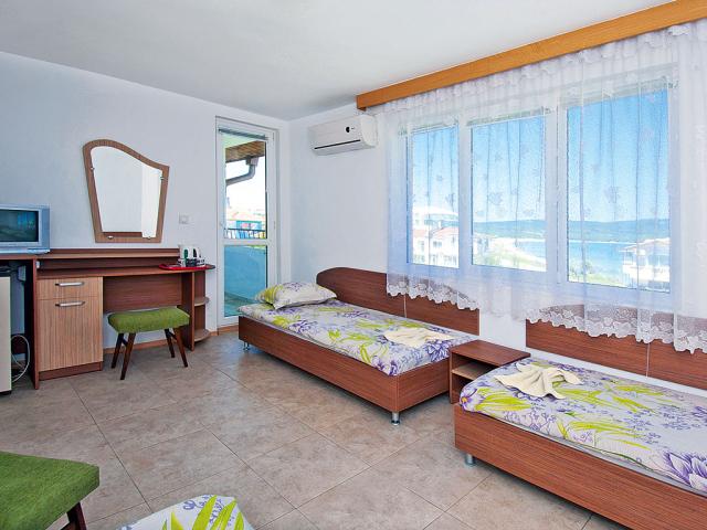 Pokoje s balkonem a sociálním zařízením (sprcha, WC) jsou klimatizovány (za poplatek, platba v místě pobytu po příjezdu) a vybaveny TV, chladničkou a varnou konvicí. Možnost jedné přistýlky (pevné lůžko). Maximální obsazenost tři dospělí. |