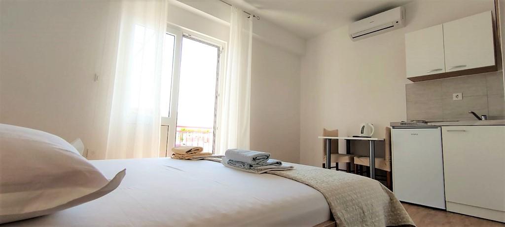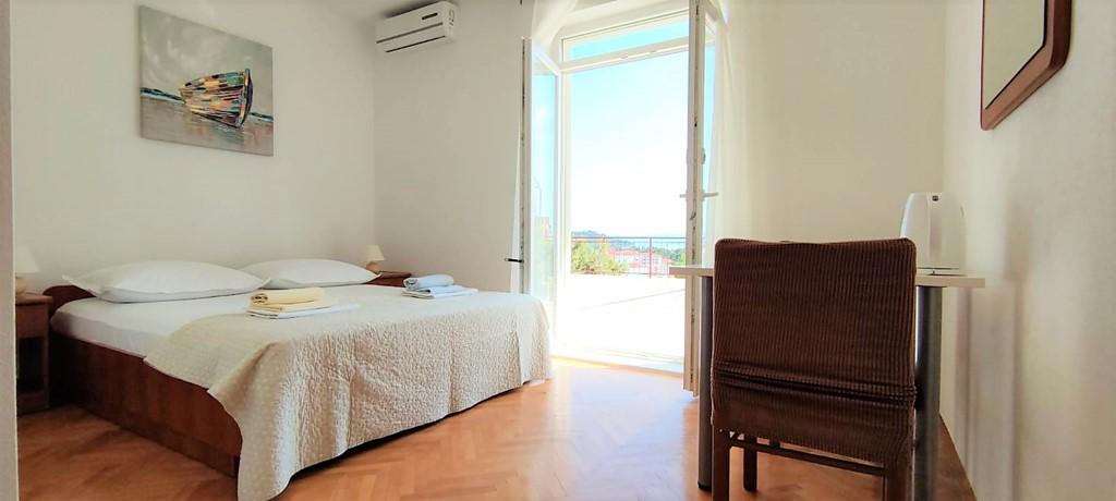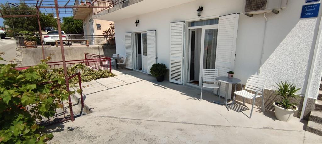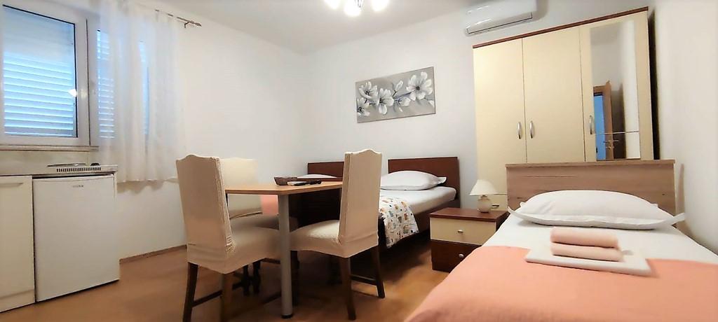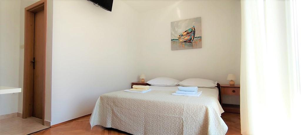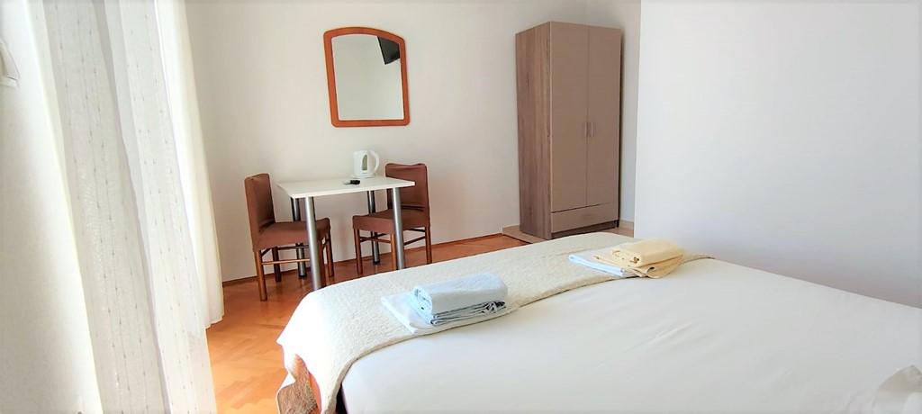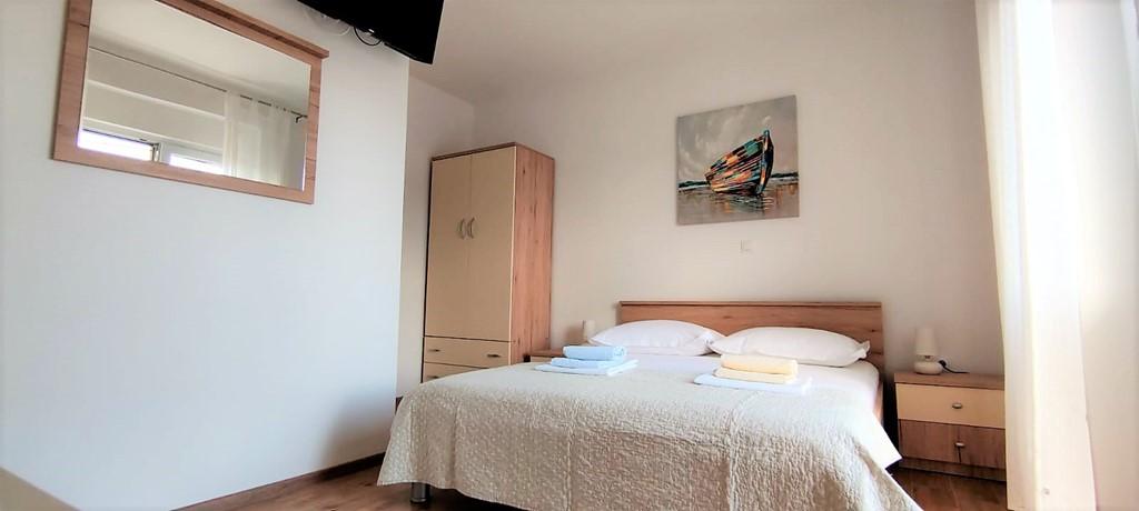 místnost se dvěma pevnými lůžky, jeden pokoj s možností 1 přistýlky (pevná postel). Každý pokoj má vlastní sociální zařízení (koupelna se sprchovým koutem a WC), TV/SAT, klimatizaci a wi-fi zdarma. Pokoj č. 1 a 3 má vlastní minikuchyňku s lednicí, v pokoji č. 2 je pouze rychlovarná konvice a minilednice. Pokoje jsou ve zvýšeném přízemí, kde se nachází společná terasa a pokoj 1 a 2 na ni mají přímý vstup. |