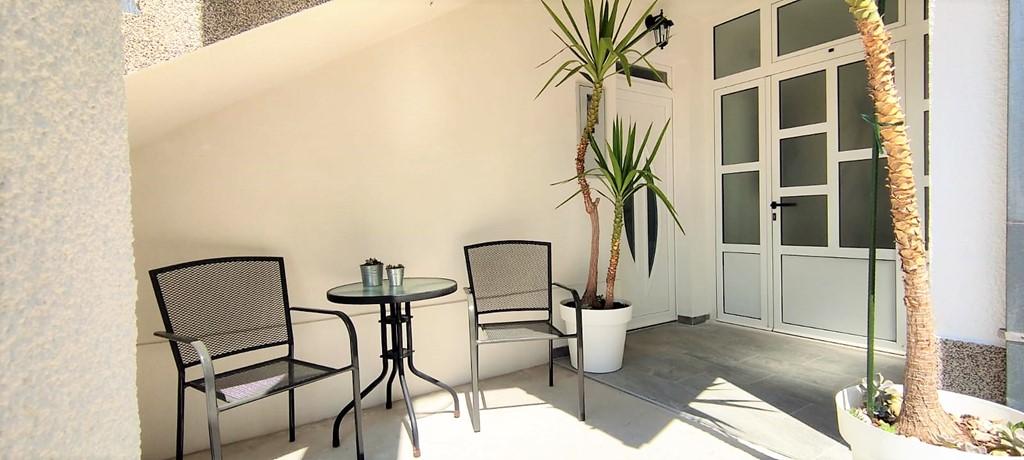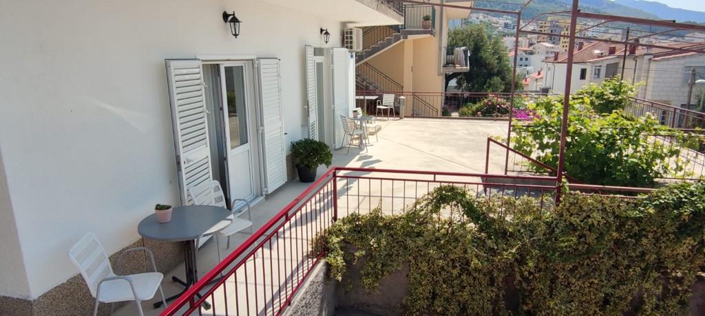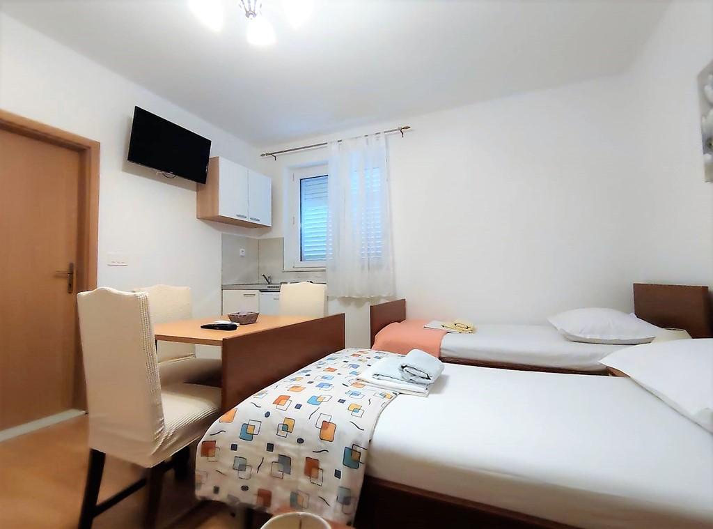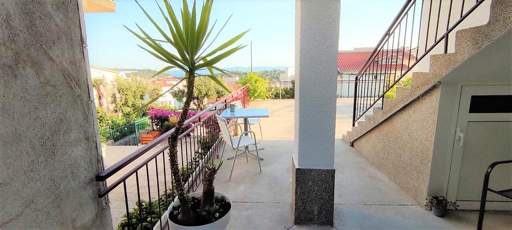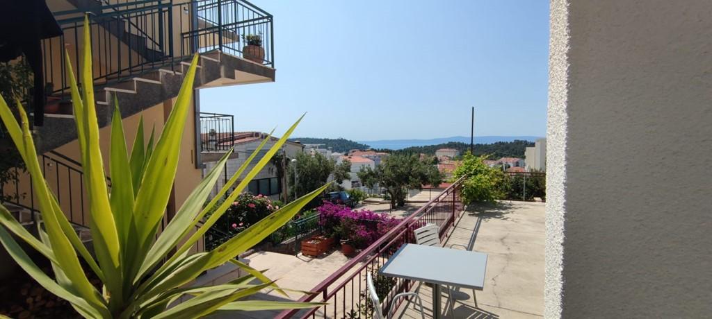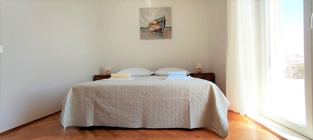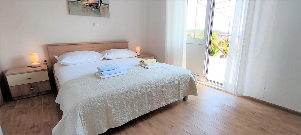 místnost se dvěma pevnými lůžky, jeden pokoj s možností 1 přistýlky (pevná postel). Každý pokoj má vlastní sociální zařízení (koupelna se sprchovým koutem a WC), TV/SAT, klimatizaci a wi-fi zdarma. Pokoj č. 1 a 3 má vlastní minikuchyňku s lednicí, v pokoji č. 2 je pouze rychlovarná konvice a minilednice. Pokoje jsou ve zvýšeném přízemí, kde se nachází společná terasa a pokoj 1 a 2 na ni mají přímý vstup. |