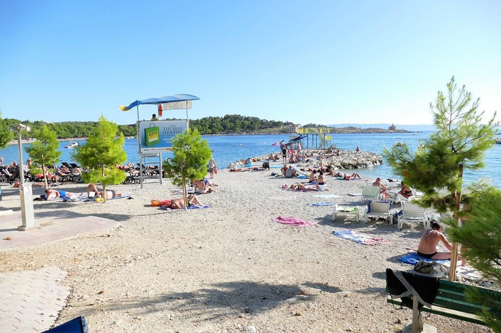 oblázková s pozvolným vstupem do moře i skalnatá s upravenými plochami. Na centrální pláži je tobogán, sprchy a bary. |