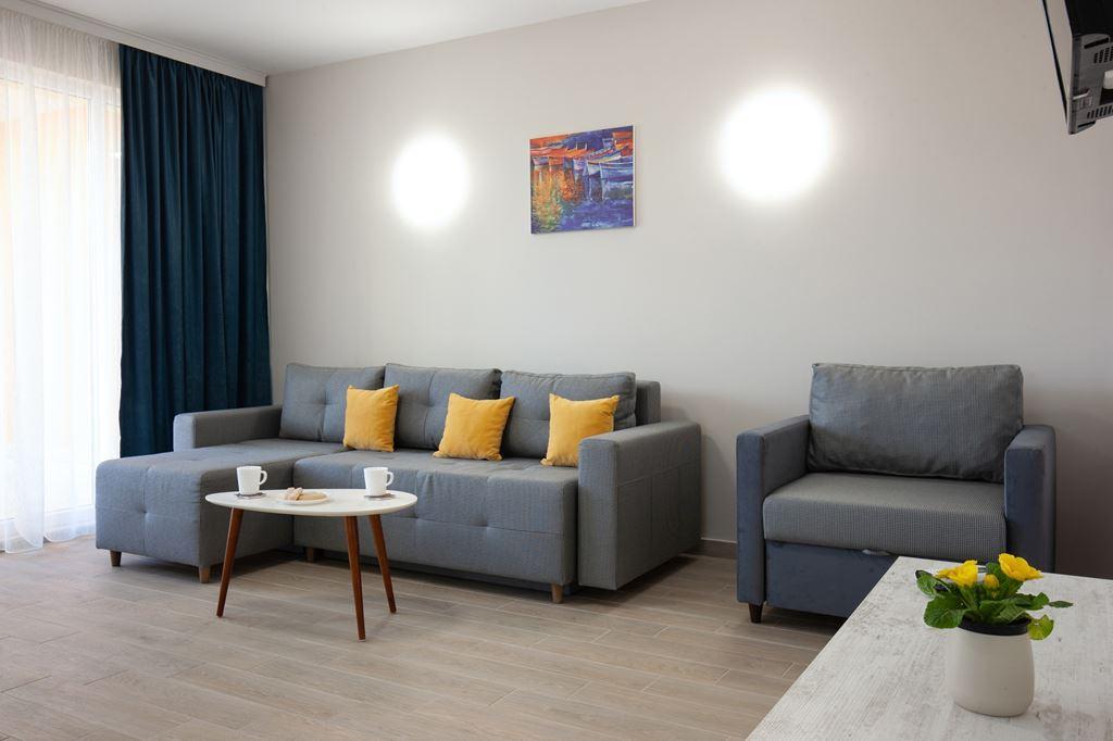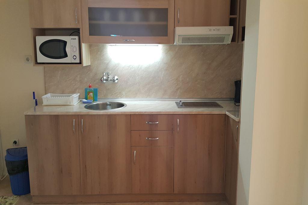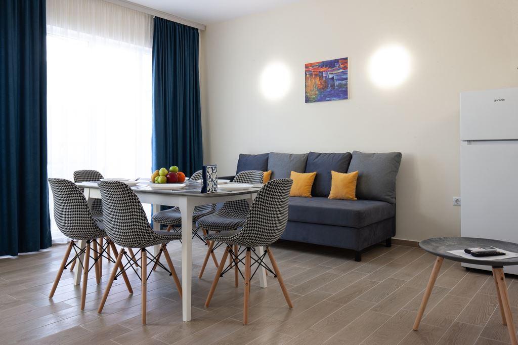 obývacím pokojem s vybaveným kuchyňským koutem a rozkládací sofa